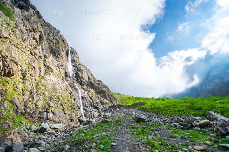 Горная долина Мидаградинская окружена гигантским барьером отвесных скал. Каменные массивы преграждают доступ к ледникам вершин Джимарай-Хох, Зейгелан и Донжеты. Северный Кавказ. Россия