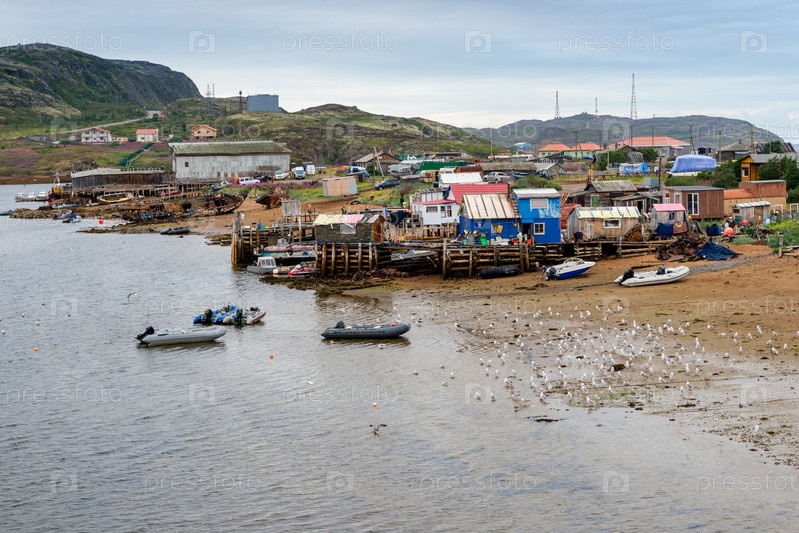 Дома и лодки на берегу Баренцева моря в Териберке, Россия