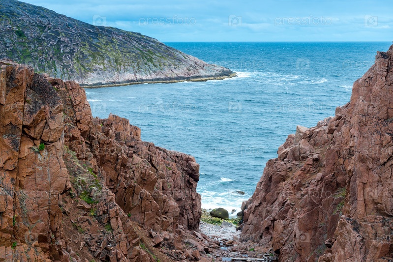 Летняя тундра. Скалистое побережье Баренцева моря около Териберки. Пейзаж русского севера. Кольский полуостров, Мурманская область, Россия