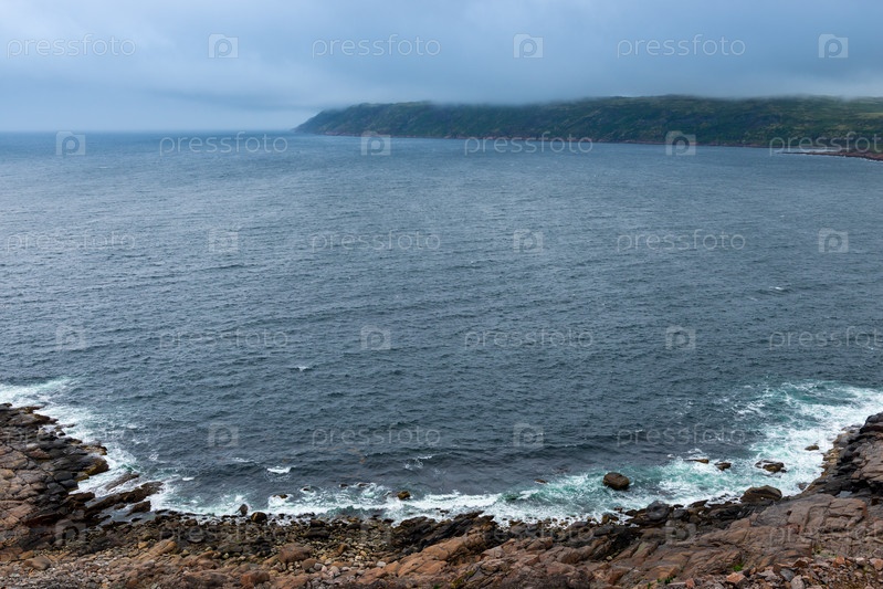 Летняя тундра. Скалистое побережье Баренцева моря около Териберки. Пейзаж русского Севера. Кольский полуостров, Мурманская область, Россия