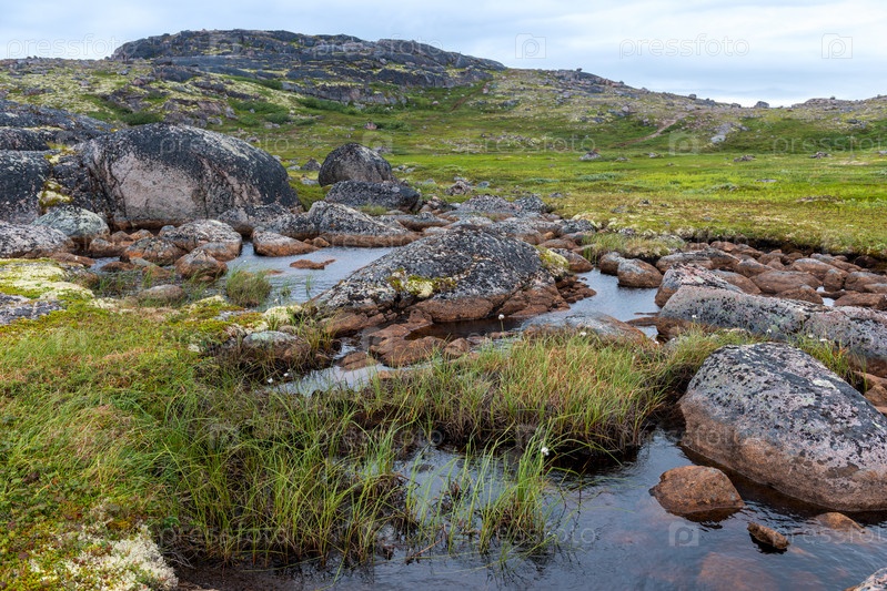 Летний пейзаж зеленой полярной тундры с валунами на переднем плане. Северная природа в окрестностях Териберки (Кольский полуостров, Россия)