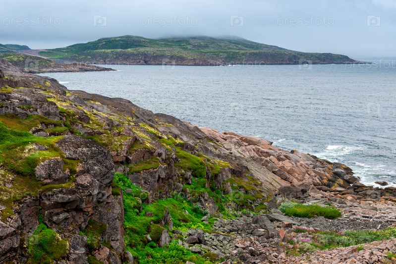 Летняя тундра. Скалистое побережье Баренцева моря около Териберки. Пейзаж русского Севера. Кольский полуостров, Мурманская область, Россия