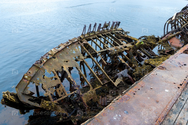 Кладбище кораблей в Териберке на побережье Баренцева моря. Старые сломанные рыбацкие лодки в воде на берегу. Кольский полуостров, Мурманская область, Россия