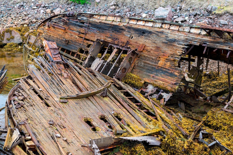 Кладбище кораблей в Териберке на побережье Баренцева моря. Старые сломанные рыбацкие лодки в воде на берегу. Кольский полуостров, Мурманская область, Россия