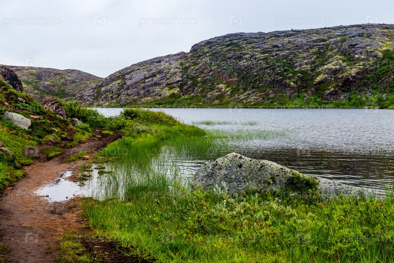 Полярный пейзаж с гранитными камнями и растениями. Северное озеро на каменном берегу