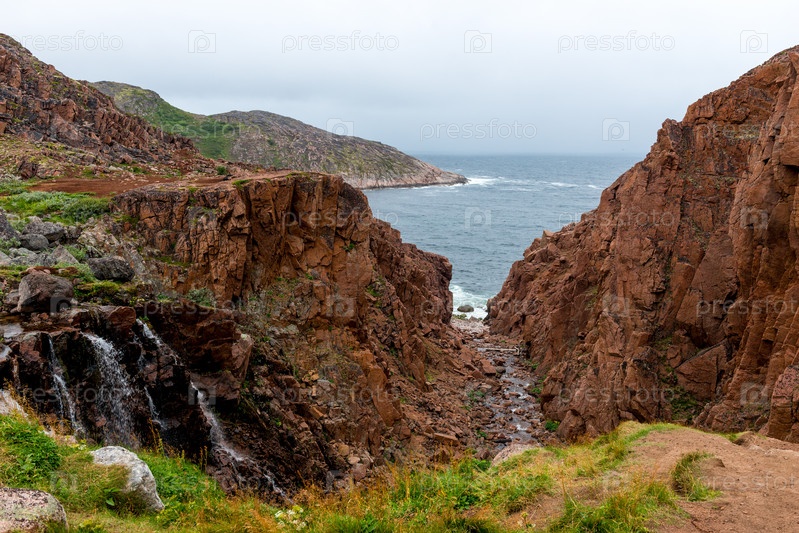 Горный водопад на севере Кольского полуострова. Водопад в каменных скалах