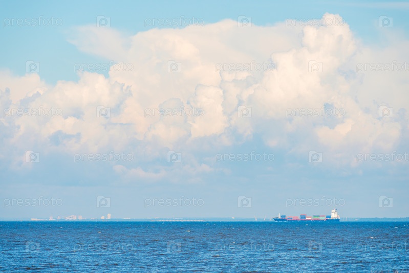 Панорамный вид на морской пейзаж с контейнеровозом на горизонте
