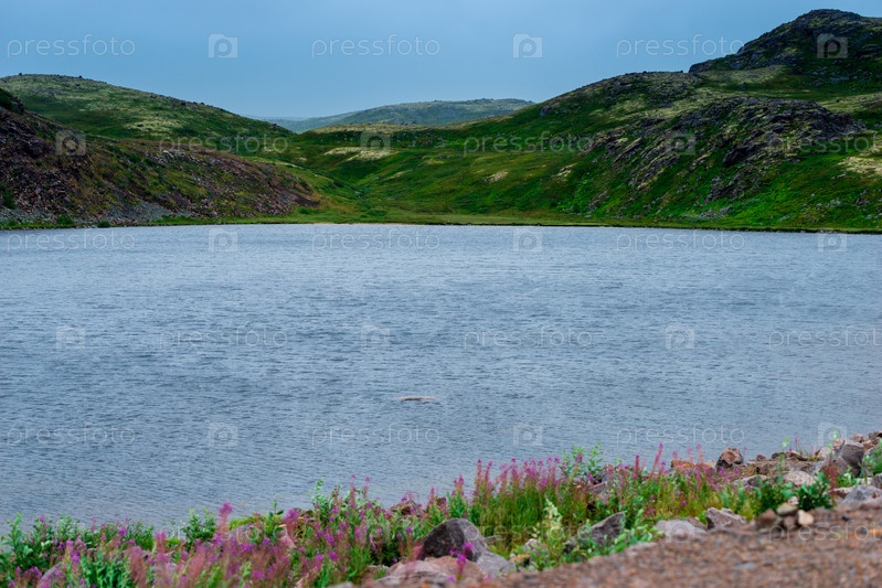 Летняя тундра. Скалистое побережье Баренцева моря около Териберки. Пейзаж русского Севера. Кольский полуостров, Мурманская область, Россия