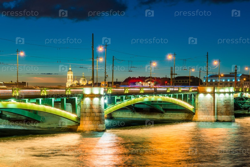 Ночной вид на Биржевой мост в городе Санкт-Петербург. Россия