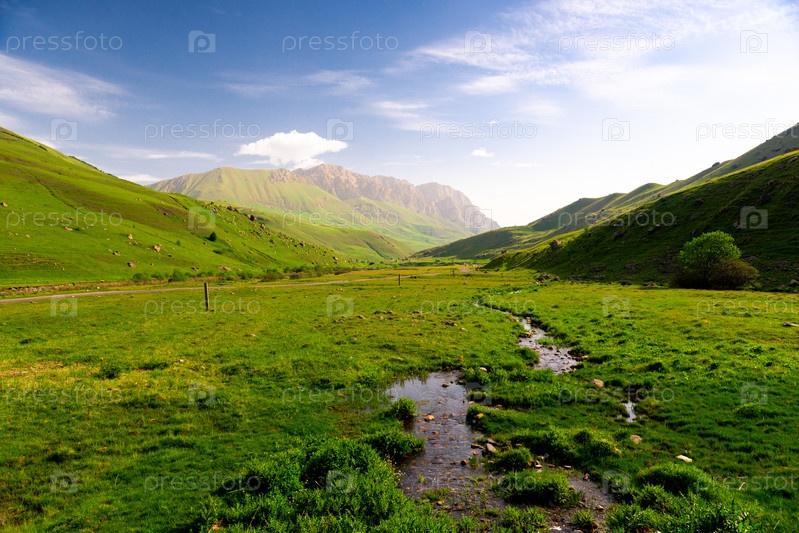 Горный ручей через луг свежей зеленой травы Северного Кавказа. Россия