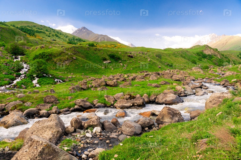 Бурная горная река на фоне живописных зеленых гор Северного Кавказа. Россия