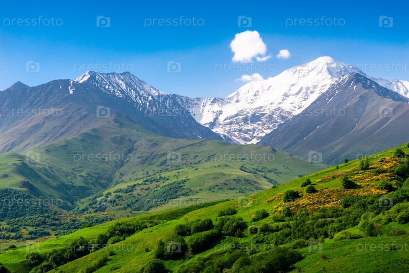 Живописный вид на белую вершину среди альпийских зеленых лугов Северного Кавказа. Россия