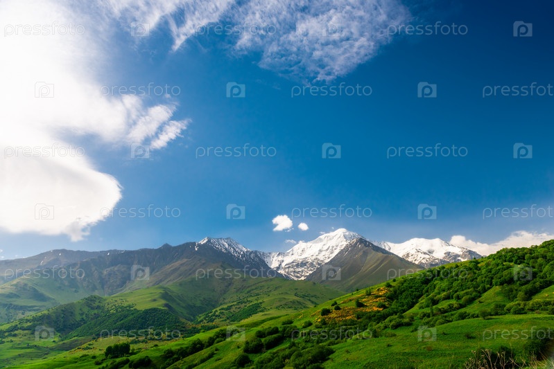 Живописный вид на белую вершину среди альпийских зеленых лугов Северного Кавказа. Россия