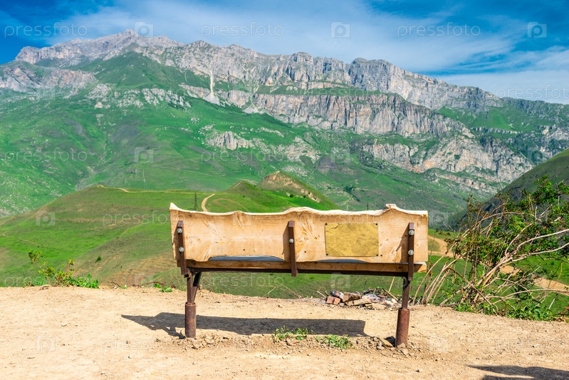 Деревянная скамейка в горах с видом на красивые живописные горы Северного Кавказа. Россия