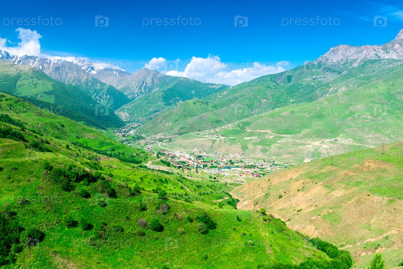 Живописный вид на горный поселок Верхний Фиагдон в горах Северного Кавказа. Россия