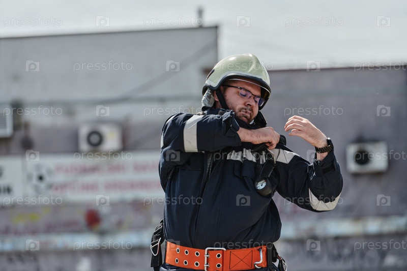 Пожарный надевает основные элементы своего профессионального снаряжения, олицетворяя стойкость, преданность делу и готовность к опасной миссии по тушению пожара, что является свидетельством его непоколебимой преданности делу защиты и спасения жизней