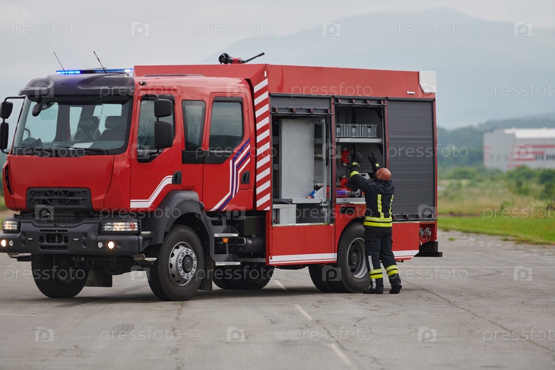 Пожарный тщательно готовит современную пожарную машину к эвакуации и реагированию на опасные ситуации, демонстрируя предельную преданность безопасности и готовность к возникновению пожара