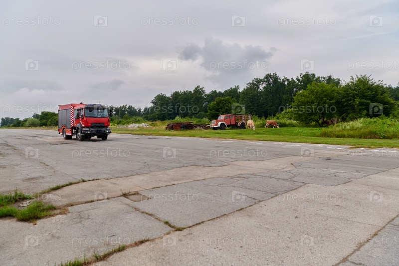 В этой захватывающей сцене современная пожарная машина, оснащенная передовыми спасательными технологиями, стоит наготове вместе со своей опытной пожарной командой, готовой вмешаться и быстро отреагировать на чрезвычайные ситуации, обеспечивая безопасность