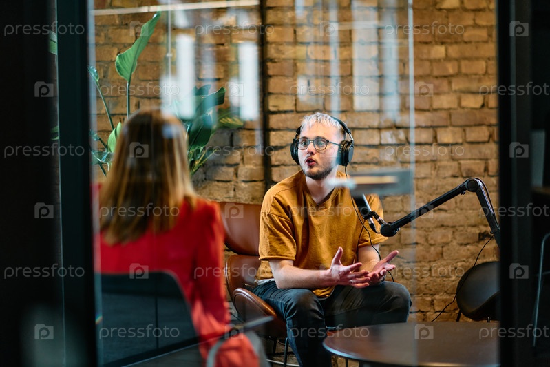 Группа молодых профессионалов бизнеса, некоторые из которых сидят в офисе со стеклянными стенами, ведут оживленную беседу и записывают онлайн-подкаст, воплощающий современное сотрудничество и динамическое взаимодействие