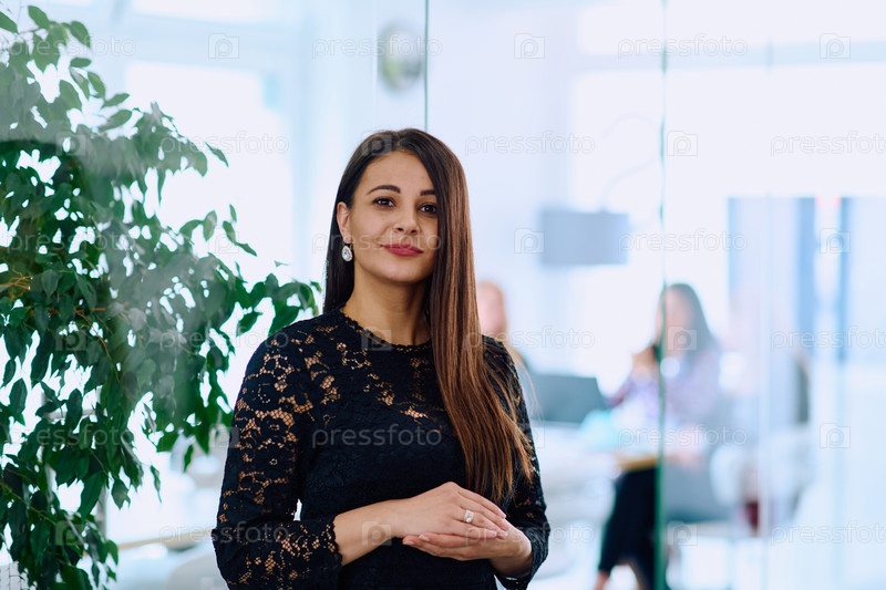 Портрет уверенной в себе деловой женщины со скрещенными руками в офисной обстановке
