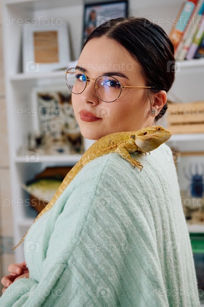 Красивая женщина позирует со своими очаровательными питомцами — бородатыми агамами