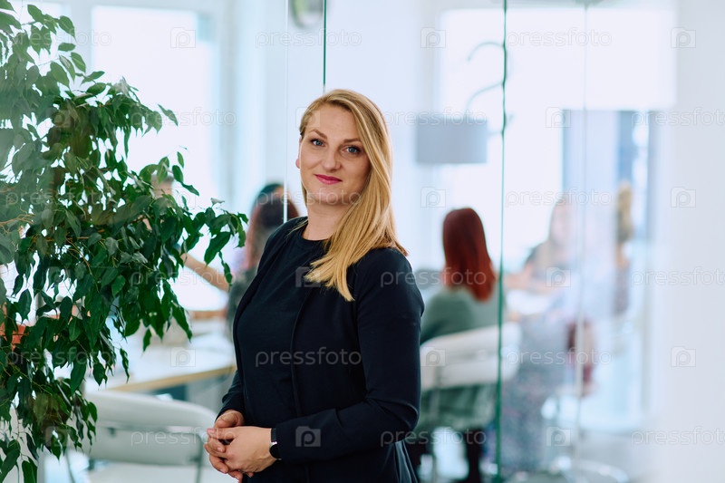 Портрет светловолосой деловой женщины в современном офисе с ее рабочим пространством и коллегами на заднем плане