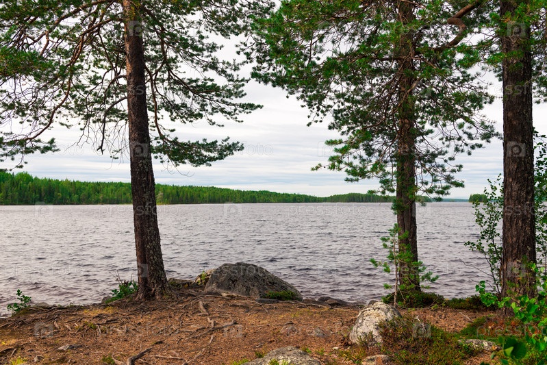 Берег озера у леса с отражениями в воде Россия, Карелия. Лесная река
