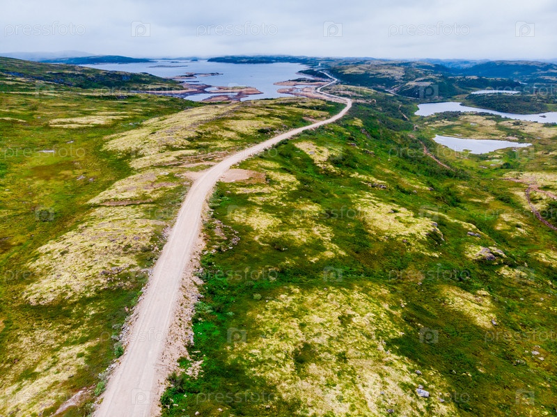 Грунтовая дорога в полярном ландшафте с гранитными камнями и растениями