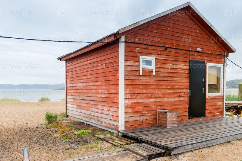 Красные деревянные дома на песчаном пляже Баренцева моря. Териберка. Россия