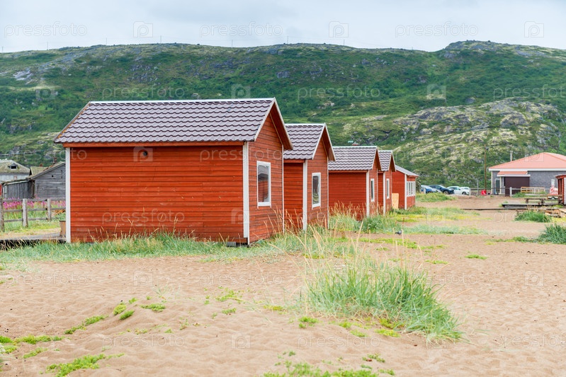 Красные деревянные дома на песчаном пляже Баренцева моря. Териберка. Россия