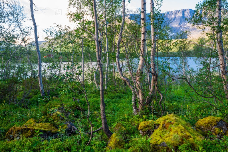 Тундровый горный пейзаж с горным озером в Хибинах