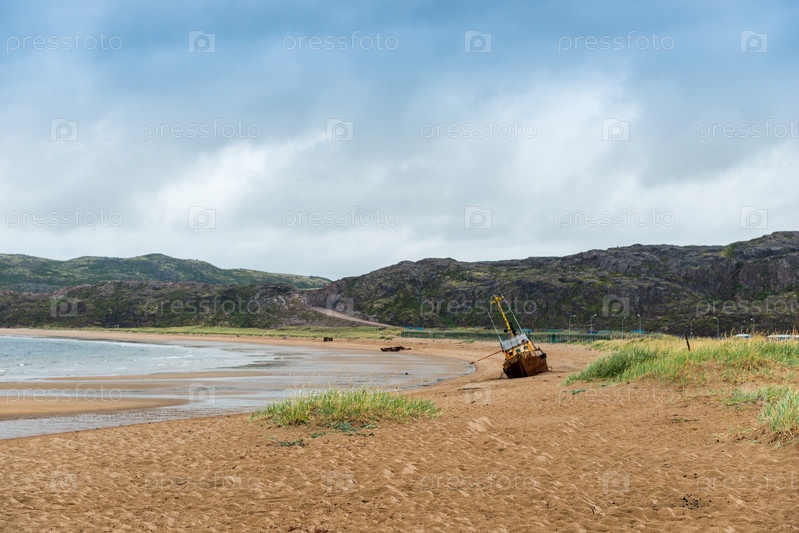 Рыболовное судно с пробоиной выбросило на пустой пляж Северного моря