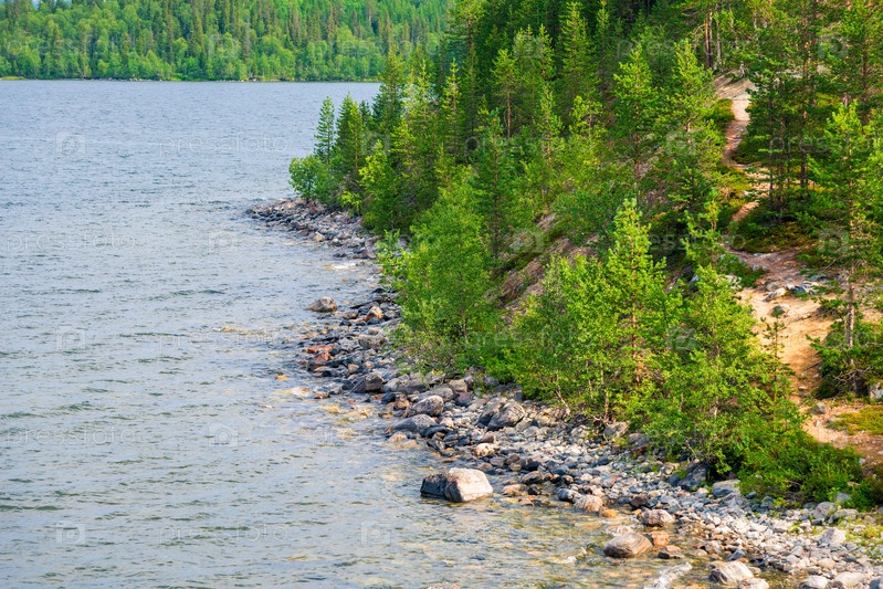 Скалистый берег северного озера, холмы в сосновом лесу