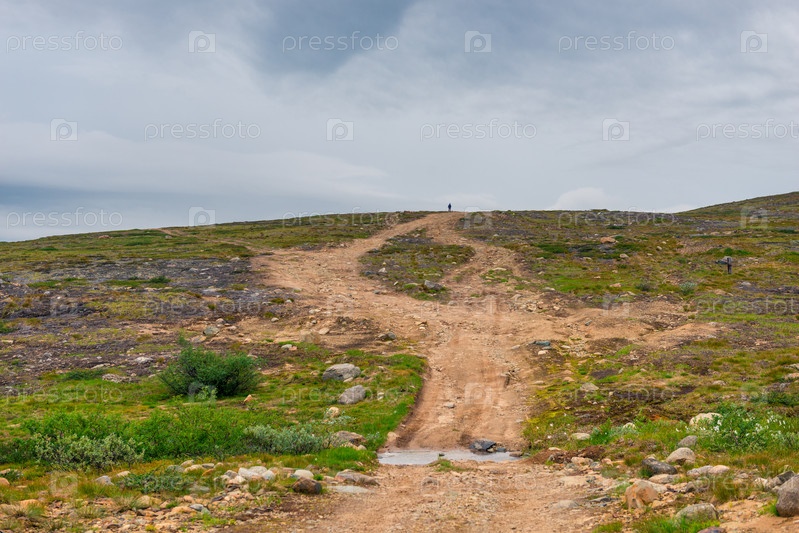 Грунтовая дорога в полярном ландшафте с гранитными камнями и растениями