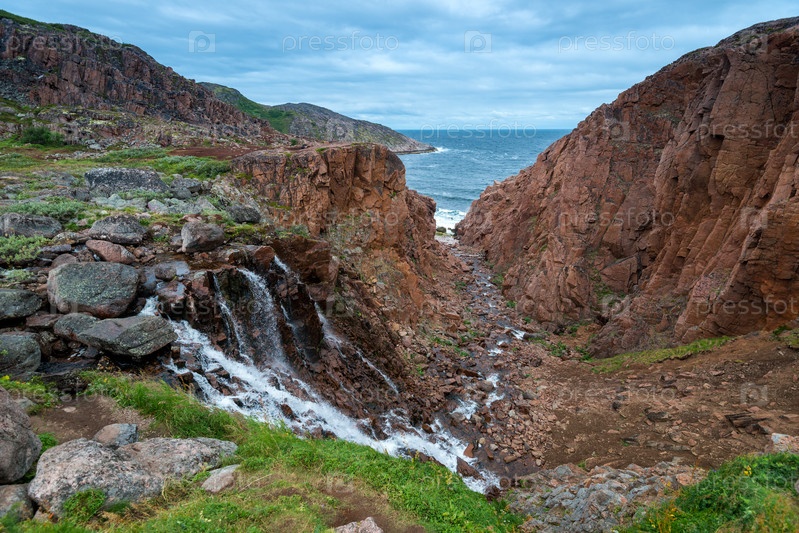 Горный водопад на севере Кольского полуострова. Водопад в каменных скалах