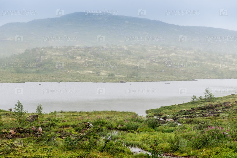 Полярный пейзаж с гранитными камнями и растениями. Северное озеро на каменном берегу