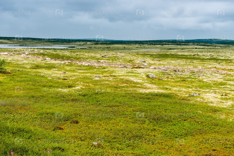 Летний пейзаж зеленой полярной тундры с валунами на переднем плане. Северная природа в окрестностях Териберки (Кольский полуостров, Россия)