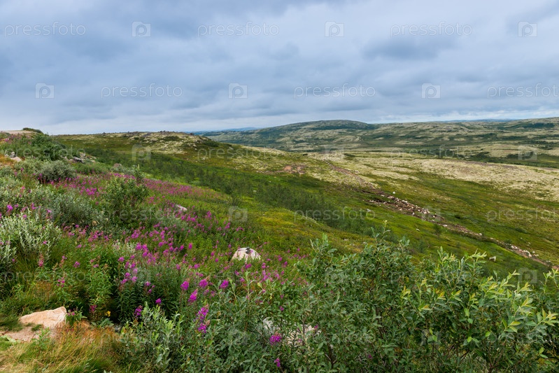 Летний пейзаж зеленой полярной тундры с валунами на переднем плане. Северная природа в окрестностях Териберки (Кольский полуостров, Россия)