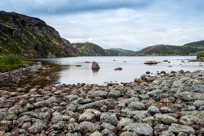 Полярный пейзаж с гранитными камнями и растениями. Северное озеро на каменном берегу