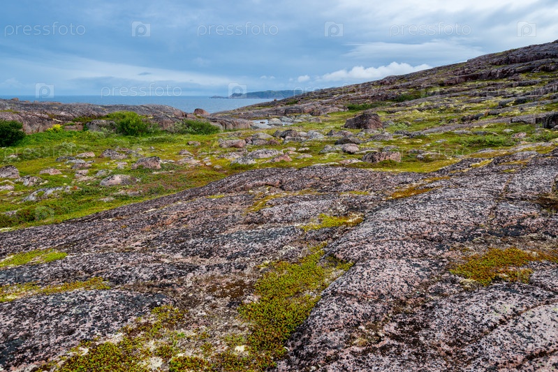 Летний пейзаж зеленой полярной тундры с валунами на переднем плане. Северная природа в окрестностях Териберки (Кольский полуостров, Россия)