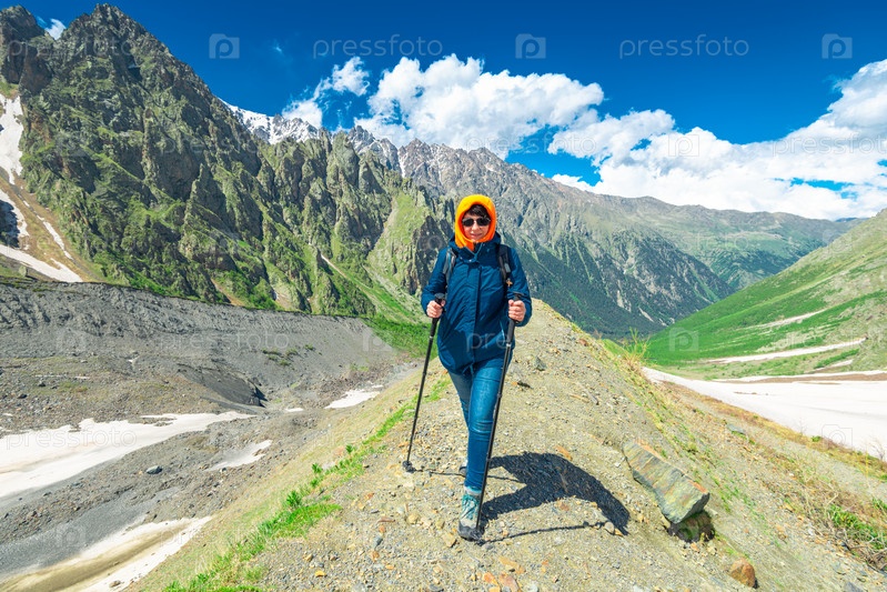 Юная туристка идет с треккинговыми палками по горной тропе на фоне живописных заснеженных гор. Северный Кавказ. Россия