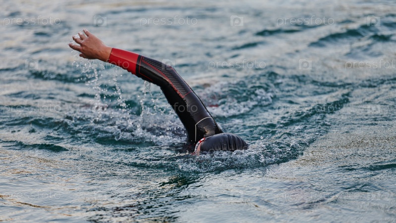 Профессиональный триатлонист с непоколебимой самоотдачей тренируется перед предстоящими соревнованиями на озере, излучая чувство атлетизма и глубокую приверженность совершенству