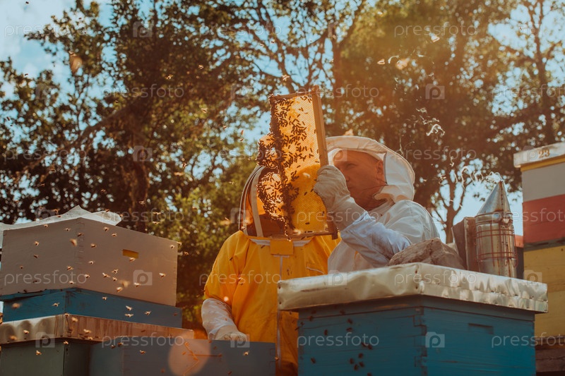 Пчеловоды проверяют мед на рамке улья в поле. Владельцы малого бизнеса на пасеке. Производитель натуральной здоровой пищи работает с пчелами и ульями на пасеке