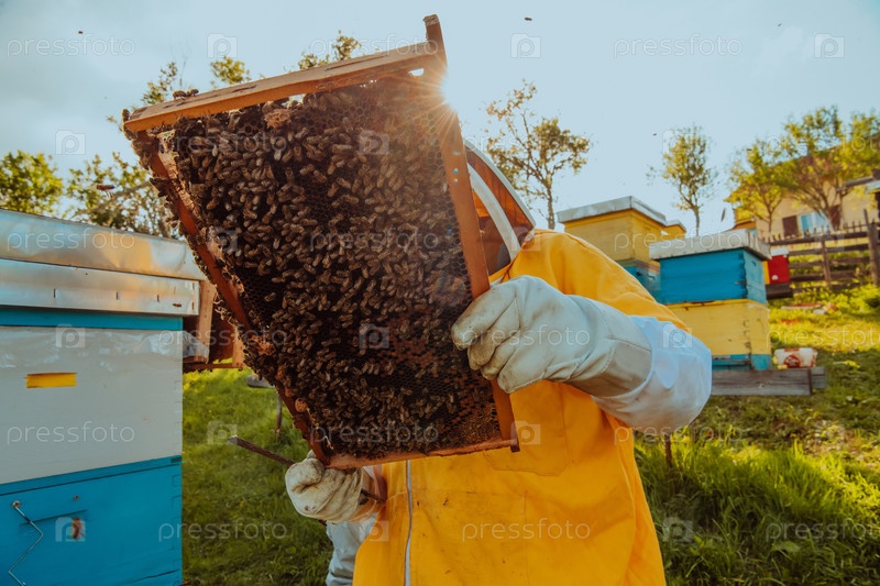 Пчеловод проверяет мед на рамке улья в поле. Владелец малого бизнеса на пасеке. Производитель натуральной здоровой пищи работает с пчелами и ульями на пасеке