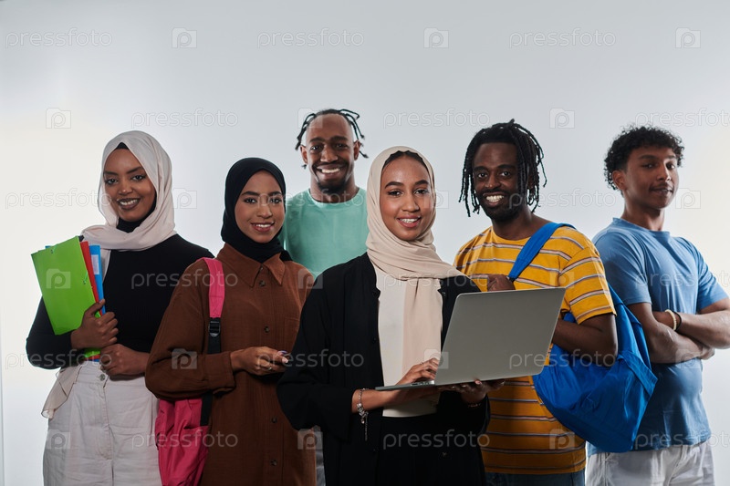 Группа разнообразных студентов занимается современными образовательными практиками, используя разнообразные технологические инструменты, такие как ноутбуки, планшеты и смартфоны, на чистом белом фоне, демонстрируя современный подход к совместному обучению