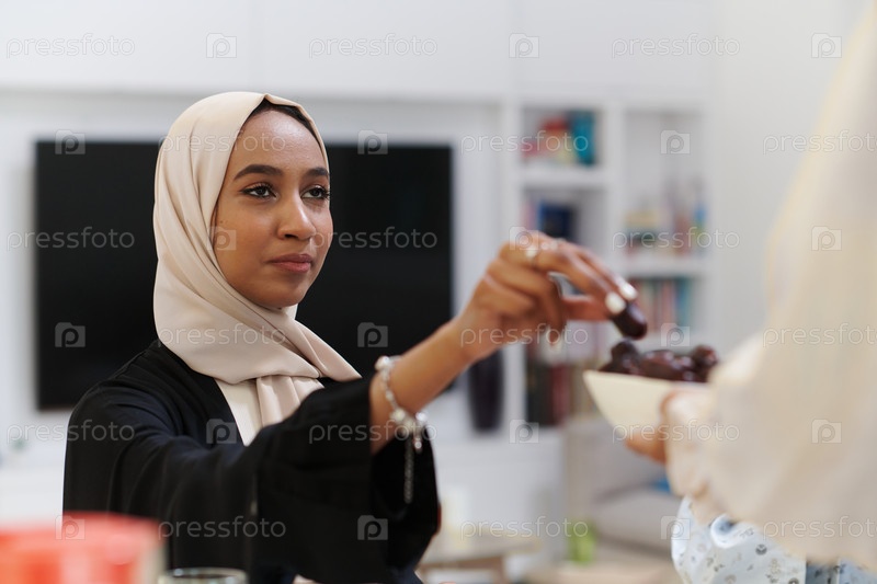 Молодая мусульманка, одетая в хиджаб, осторожно берет финики, символизируя завершение поста в священный месяц Рамадан, воплощая собой сцену духовного размышления, культурных традиций и ожидания общественного ифтара