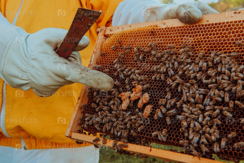 Пчеловод проверяет маток на наличие сот. Пчеловоды проверяют качество меда и наличие медовых паразитов. Пчеловод работает с пчелами и ульями на пасеке