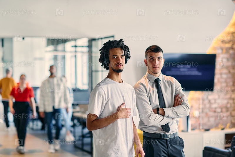 Группа коллег, включая афроамериканского бизнесмена и молодого лидера в рубашке и галстуке, позируют вместе в современном офисе коворкинг-центра, представляя собой динамичное сочетание профессионализма и сотрудничества
