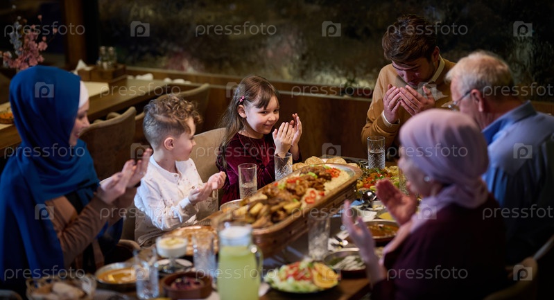 В современной обстановке ресторана европейская исламская семья собирается вместе на ифтар во время Рамадана, совершая молитву перед едой, объединяя традиции и современные обычаи в праздновании веры и семьи