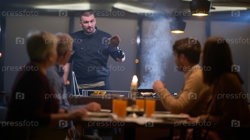 В ресторане профессиональный шеф-повар представляет гостям жареный стейк, приготовленный на открытом огне, в то время как европейская мусульманская семья с нетерпением ждет ифтара во время священного месяца Рамадан, сочетая кулинарное мастерство с культур